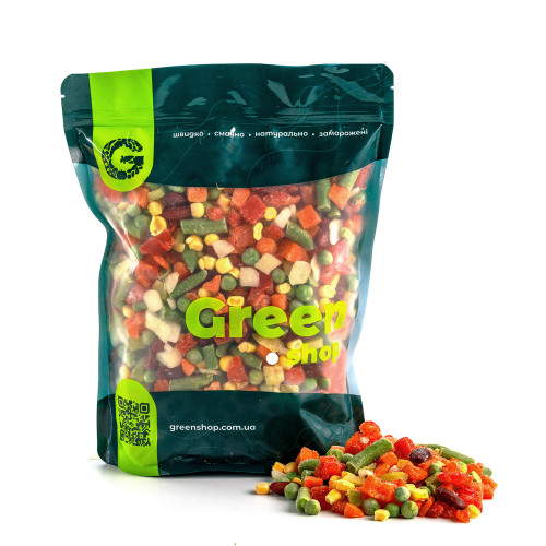 Склад: перець солодкий(меланж) різаний (20%), морква різана (20%), квасоля стручкова (20%), горошок зелений зерна (20%), кукурудза цукрова зерна (20%).