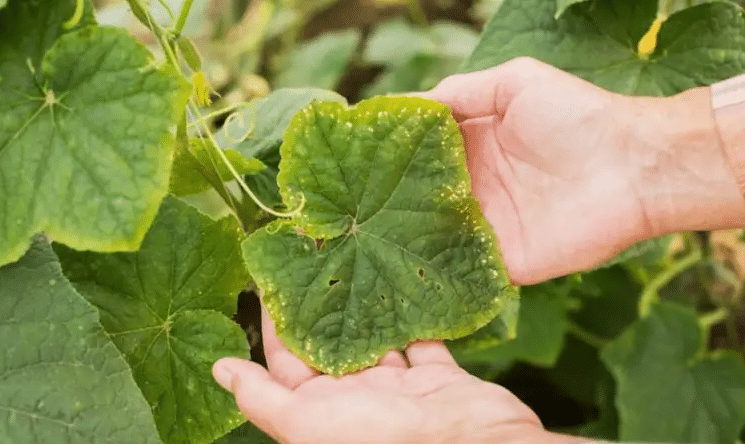плоди починають гнити просто на кущах; · край листя стає коричневим, а між прожилками — білі плями; · батоги огірків швидко в’януть і не ростуть.