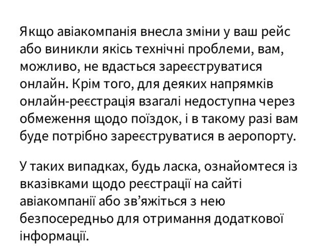 Коли можна пройти онлайн-реєстрацію? Онлайн-реєстрація відкривається за 24 години до вильоту і завершується з 90 хвилин до вильоту.