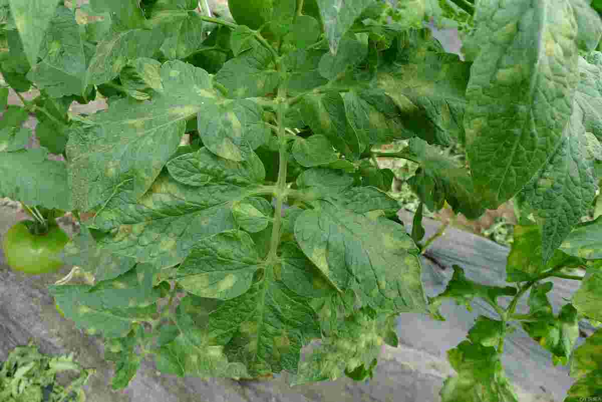 Листя помідорів жовтіє по краю, зберігає зелене забарвлення тільки їх основу. Обриси не пожовклої частини листа має форму трикутника. Така зміна властива як молодим, так і старим листям. Через деякий час вони починають опадати, рослина стає слабкою і має болісний вигляд.