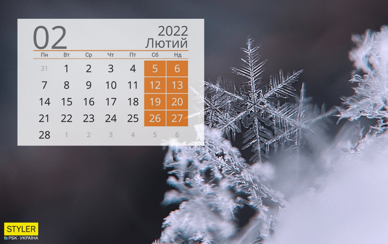 Виробничий календар на Лютий 2022 року в Україні. Святкові, вихідні та робочі дні лютого 2022 рока. Календар на 2022 рік зі святами та вихідними.
