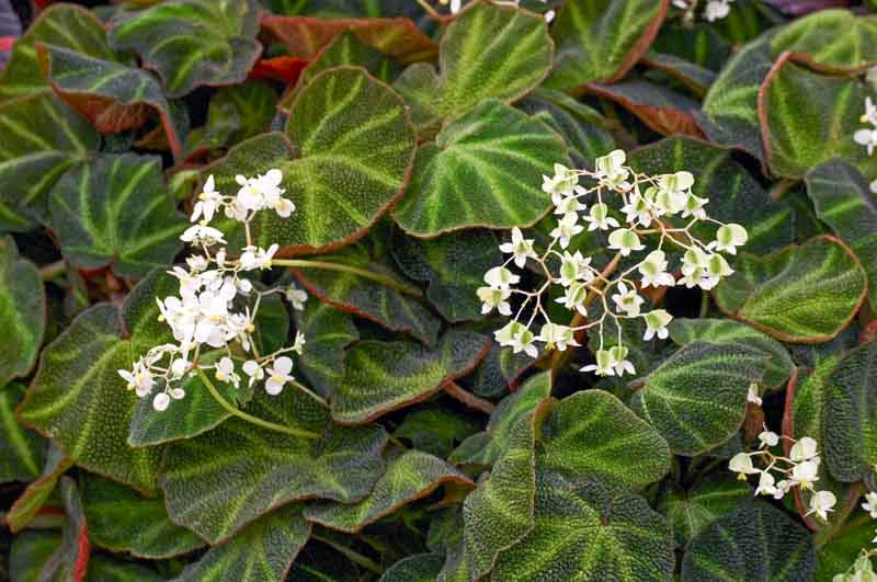 Begonia Soli Mutata blooms clusters of white flowers and earns its name as its appearance is dependent on overall light intensity. High humidity is preferable during grow season and overwatering can lead to fungal problems or rot.