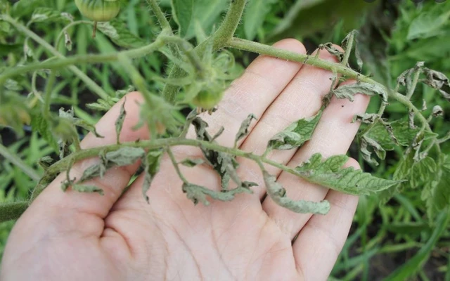 Фузаріоз томатів Інфікування виявляється появою жовтого та блідо-зеленого забарвлення, деформацією черешків, закручуванням і обпаданням листя, виникненням рожевого нальоту в місці кореневої шийки, відмиранням коренів і повним засиханням куща.