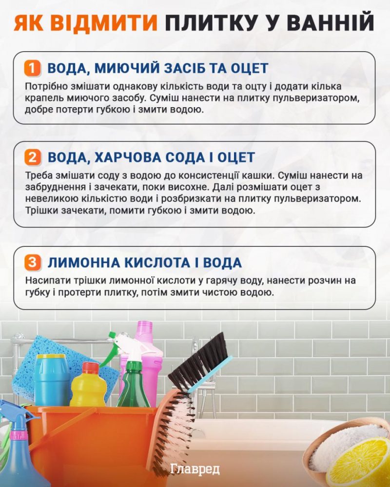 Сода і оцет. Для цього потрібно змішати соду та оцет у пропорції 1:1, потім нанести цю пасту на 20 хвилин на забруднену плитку. Потім змийте водою. Цей засіб чудово відбілить плитку, прибере застарілий наліт, позбавить кахель у ванній жовтизни.