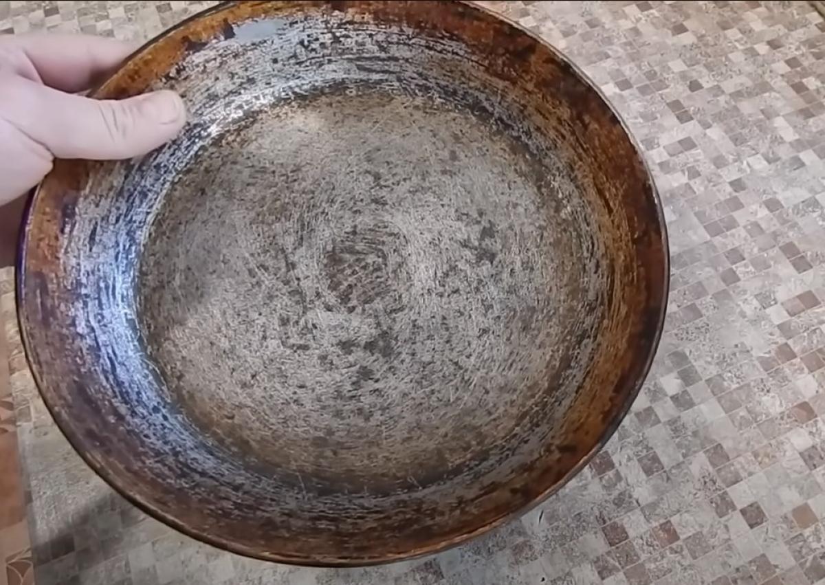 Змішайте 2 столові ложки харчової соди з 1 літром теплої води. Замочіть сковорідку на 20-30 хвилин, після чого ретельно промийте м'якою губкою. Якщо залишки нагару залишаються, повторіть процедуру.