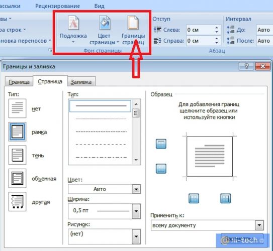 Щоб зробити рамку навколо всієї сторінки, дійте наступним чином: У відкритому документі відкрийте вкладку»Дизайн" на верхній панелі. У блоці з фоном сторінки натисніть на кнопку " межі сторінок» . У вікні, на вкладці»сторінка" у розділі " Тип» виберіть шаблон з рамкою.