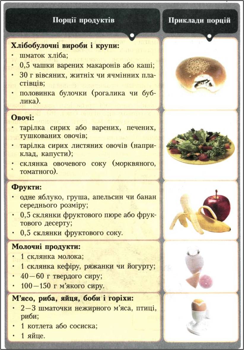 Загалом протягом дня потрібно вживати: 4-5 скибочок хліба, 150-200 г каші чи вермішелі; 3-4 яблука чи інших фруктів, 2 склянки соку, 350-500 г салату, 200 г картоплі; склянку молока, по 50 г масла і сиру, 200 г кефіру чи йогурту; по 50-100 г м'яса чи риби; 1-2 яйця, 125 г квасолі чи гороху.