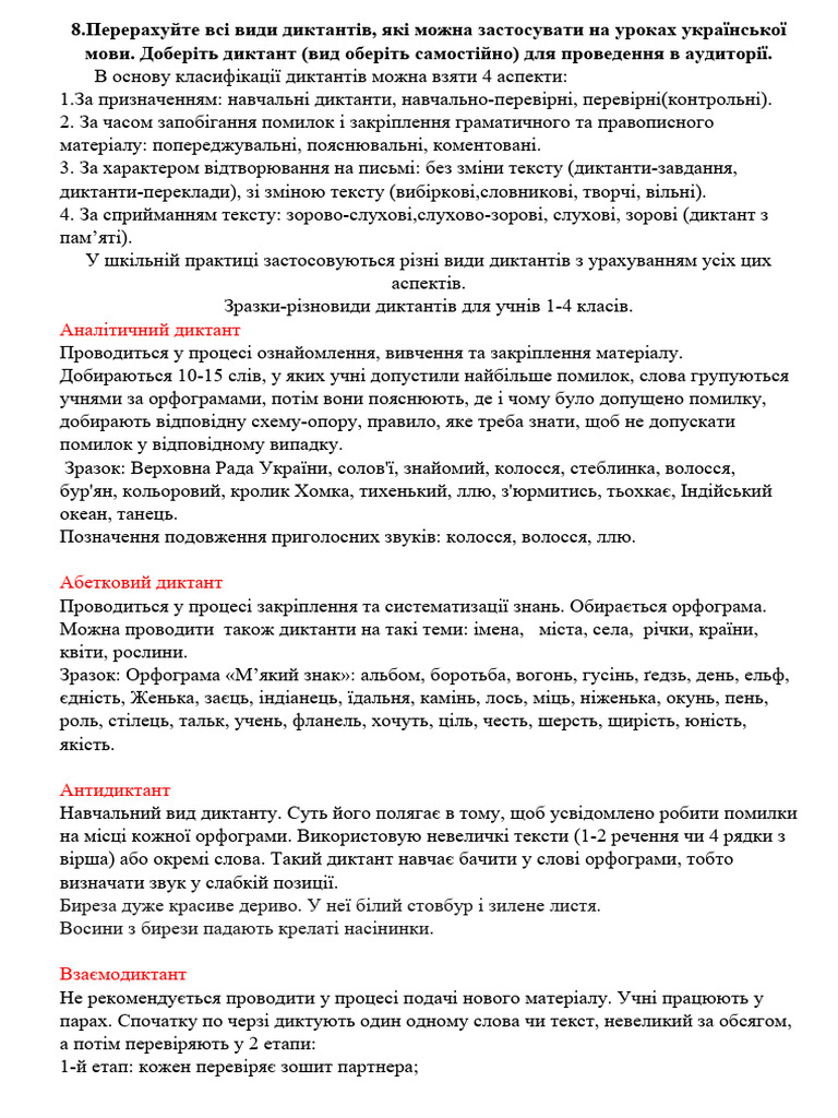 Словниковий диктант · Вибірковий диктант. · Розподільчий диктант · Міні-диктант · Пояснювальний диктант · Самодиктант · Усний диктант · Вільний диктант.
