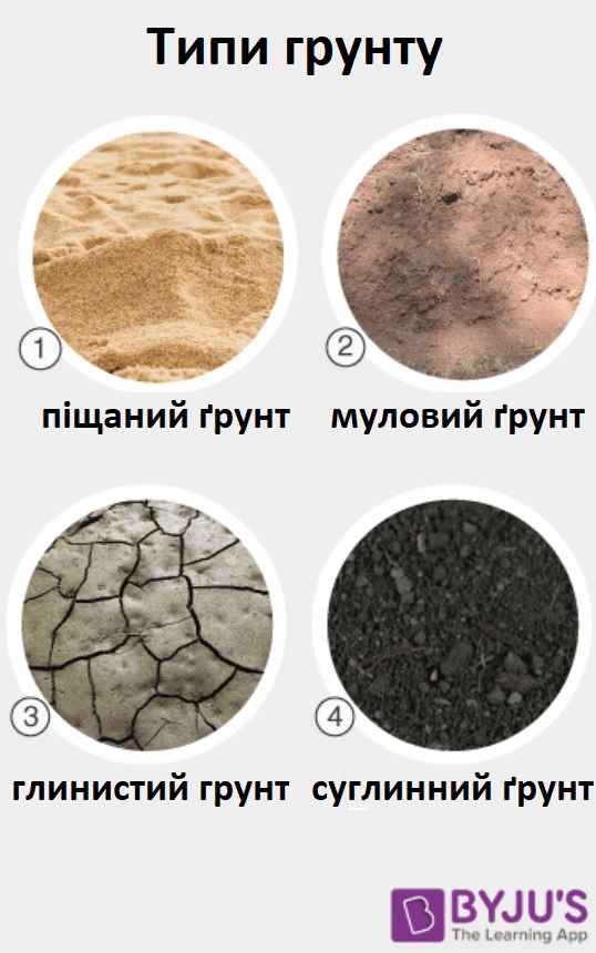Види ґрунтів · Піщані ґрунти · Супіщані ґрунти · Торф’яно-болотні ґрунти · Кам’янисті ґрунти · Суглинкові ґрунти · Глинисті ґрунти · Крейдяні ґрунти.